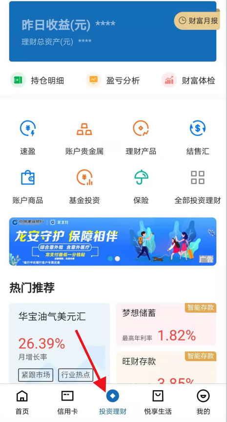 第一步:登陸建行手機銀行,在手機頁面最下冊中間位置,找到“投資理財”
